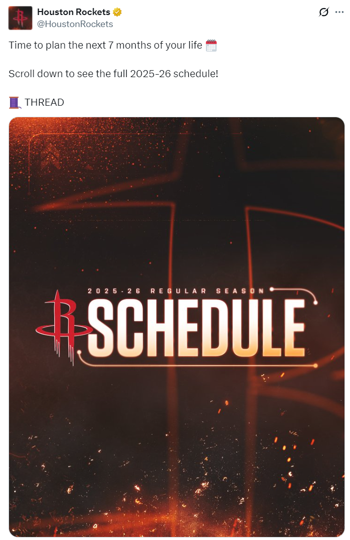 凯文-杜兰特的加盟让这支火箭队有了揭幕战、年终大战的排场,除此之外火箭队还有28场全美直播排在联盟第二多(与森林狼并列),仅次于勇士、雷霆、湖人、尼克斯34场全美直播,休媒详细解读了火箭队这波赛程。